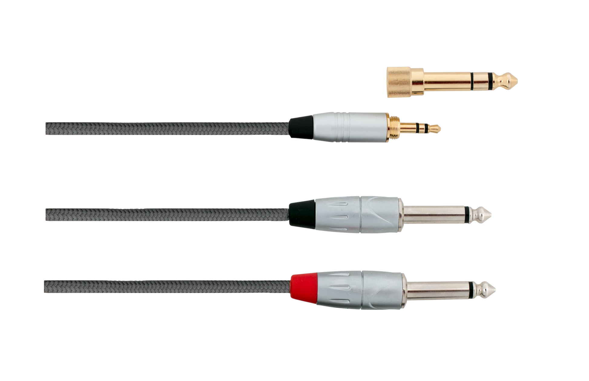 3.5mm stereo Jack plug (M) with 6.3mm adaptor to 2 x 6.3mm mono Jack plugs (M). High quality 4.5mm OD grey overbraid audio cable.