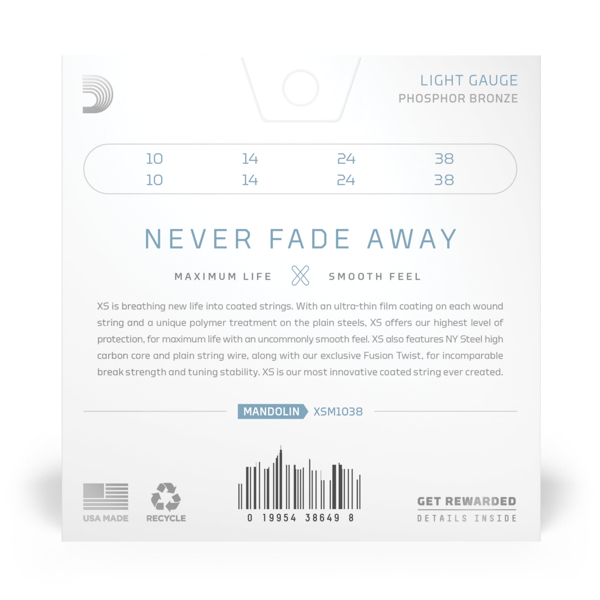 - XS Phosphor Bronze strings have the longest life of any D’Addario mandolin string, thanks to the ultra-thin XS film coating.