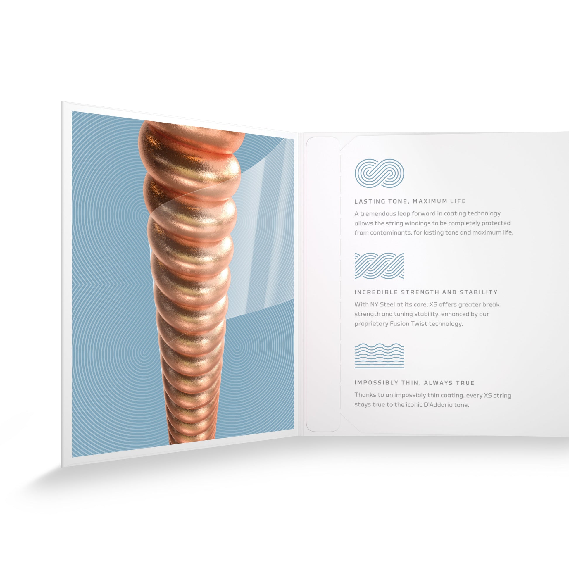 XS is breathing new life into coated strings. With its ultra-thin film coating on every wound string and a unique polymer treatment on the plain steels, XS offers our highest level of protection, for maximum life with an uncommonly smooth feel. XS also features NY Steel high carbon core and plain string wire, along with our exclusive Fusion Twist, for incomparable break strength and tuning stability. XS is the most innovative coated string ever created. Never fade away!