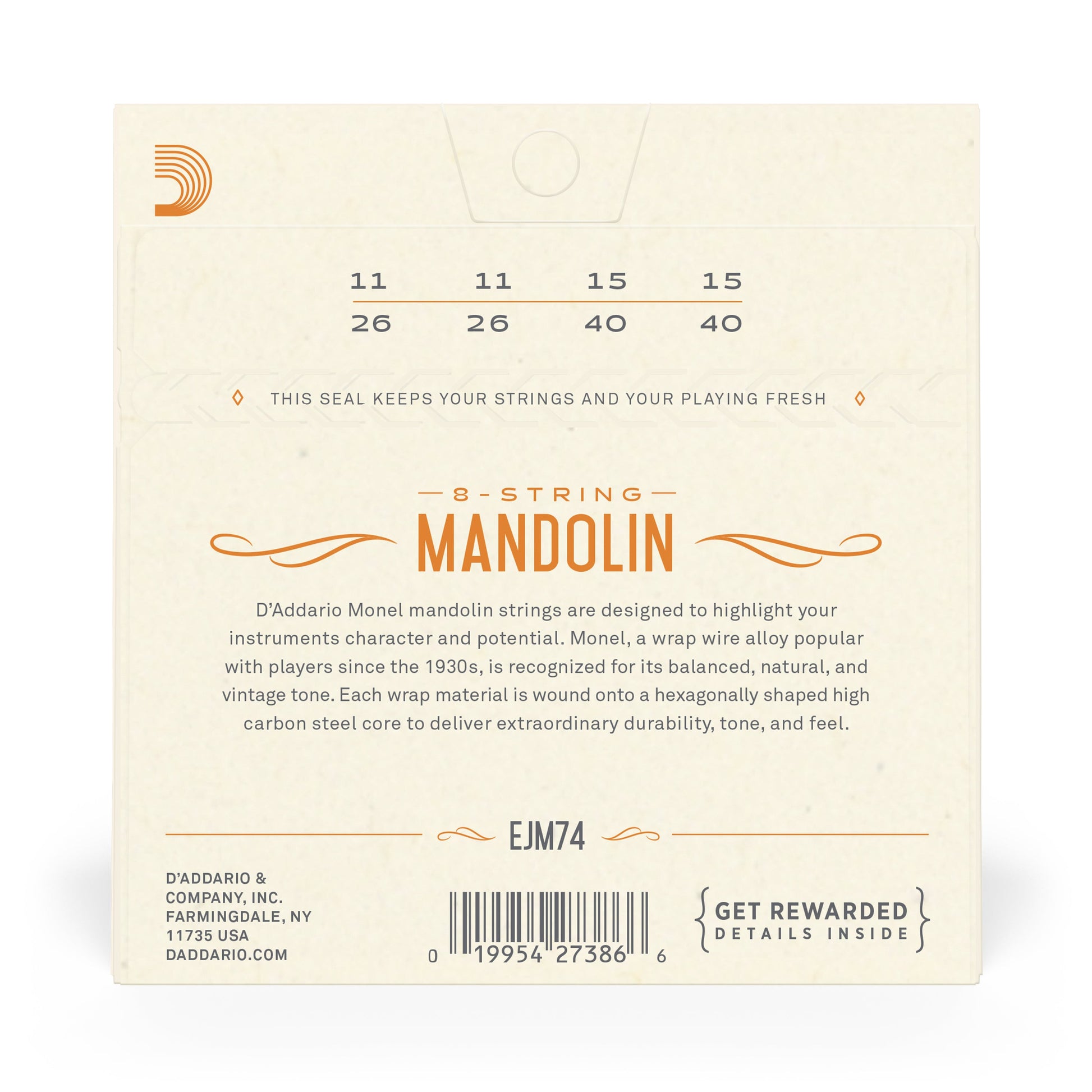EJM74 is D'Addario's premiere monel mandolin offering based on our most popular medium gauge mandolin set. Monel is a vintage alloy that offers a balanced and natural tone. Loop-end construction for universal fit.