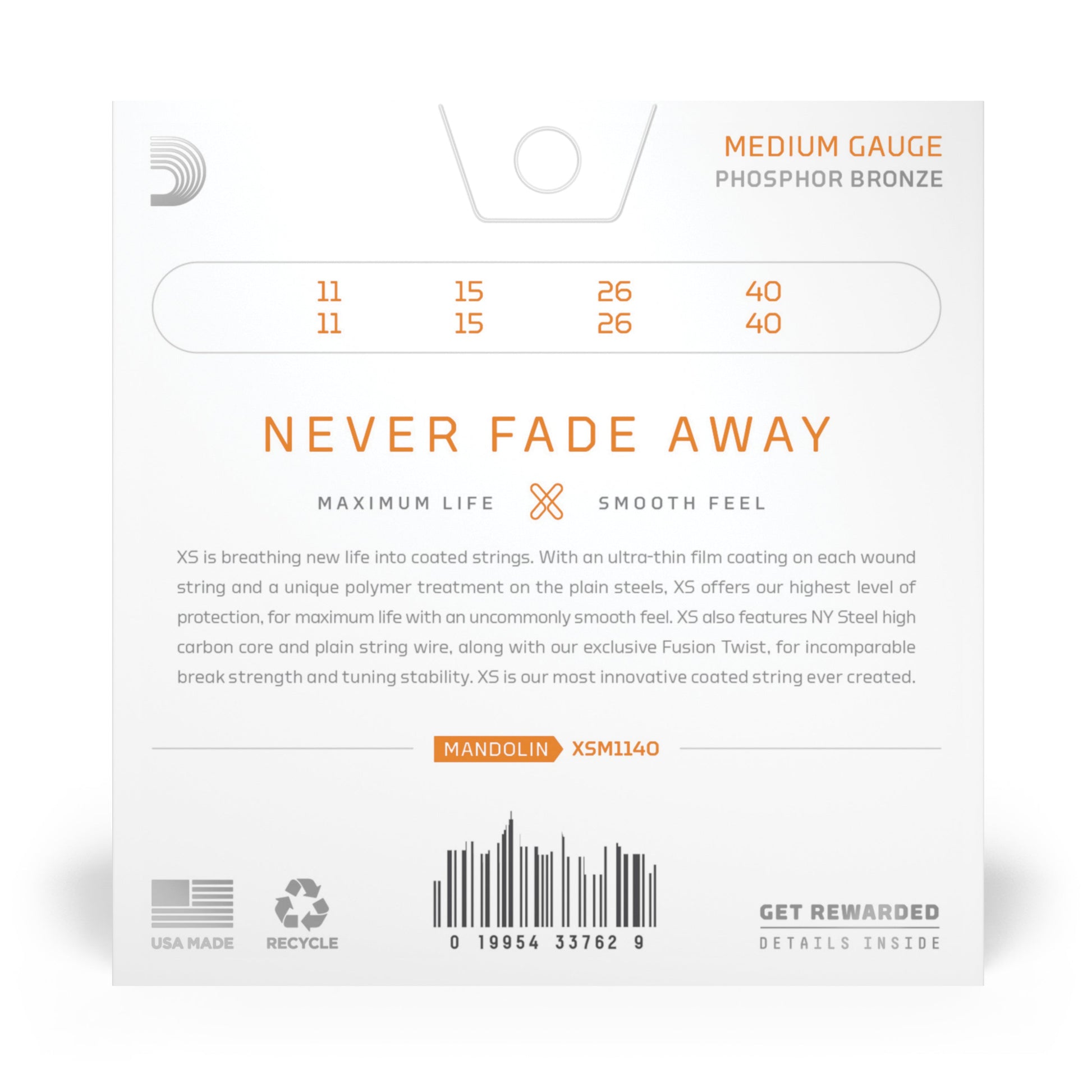 Born from our greatest breakthrough in string innovation, XS Phosphor Bronze strings have the longest life of any D’Addario mandolin string. The XS coating gives our warm, balanced phosphor bronze strings maximum life, with an uncommonly smooth feel. Made with a NY Steel core, phosphor bronze wrap wire and Fusion Twist technology, XS coated mandolin strings have incomparable break strength and tuning stability, in addition to their dramatically increased lifespan. 11-40 Custom Medium gauge strings provide more volume and resonance than Light strings, while still maintaining playability.