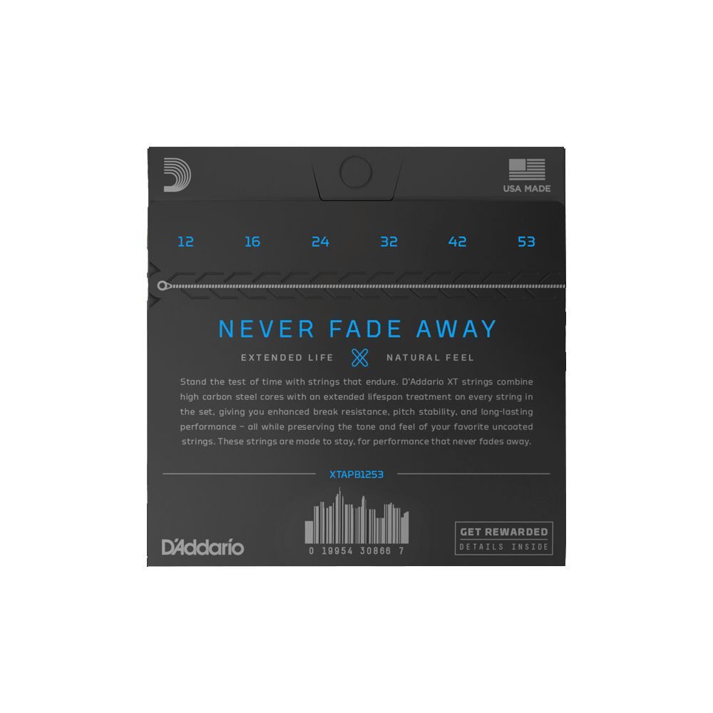 Since D'Addario introduced Phosphor Bronze acoustic guitar strings in 1974, they've been synonymous with warm, well-balanced tone. XT Phosphor Bronze offers that and more, boasting enhanced break resistance, better pitch stability, and longer life than our standard phosphor bronze strings. The XT coating delivers advanced corrosion resistance, while still retaining the warm tone and natural feel of the uncoated string. Beneath the coating, these XT acoustic strings are constructed with a NY Steel core, phosphor bronze wrap wire, and Fusion Twist technology, affording tonal versatility with added resilience, excellent for a wide range of acoustic styles. 12-53 Light strings are our most popular acoustic gauge, providing a nice balance of playability and tone.