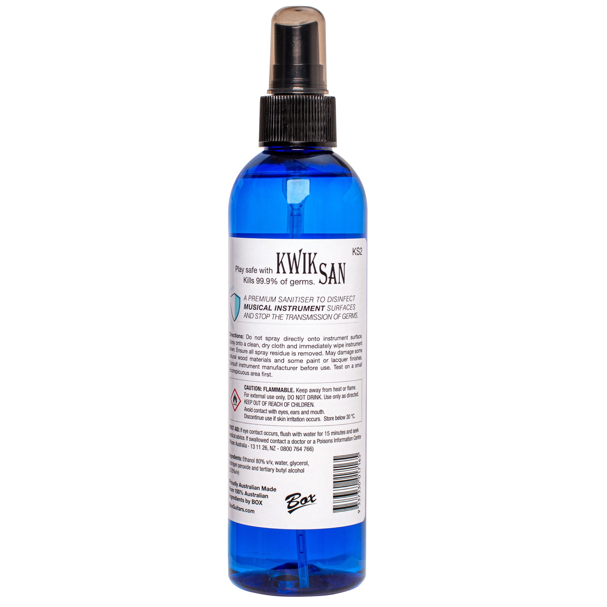 Premium, fast acting spray sanitiser specially formulated to disinfect musical instrument surfaces and stop the transmission of germs. Hospital grade, alcohol based sanitiser. Antibacterial protection. Kills 99.9% of germs quickly and effectively. 100% Australian ingredients. Made in Australia by Stu Box.