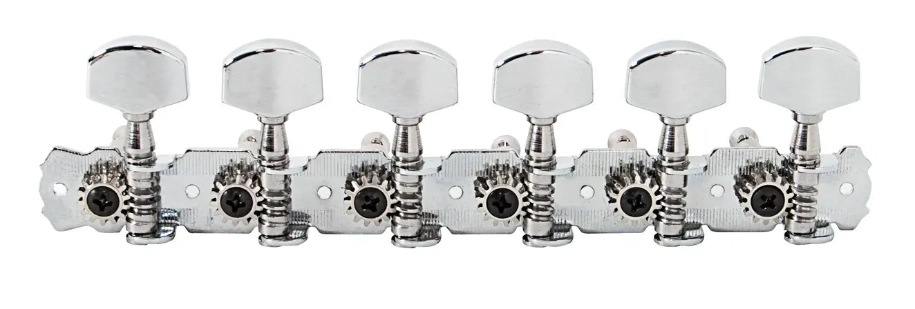 Upgrade your 12-string guitar with the Custom Eagle 6-In-Line Nickel Guitar Machine Heads, designed for both functionality and style. These tuners enhance tuning stability while adding an elegant touch to your instrument. Key features include: - 6-a-side configuration specifically for 12-string guitars - Beautifully engraved nickel plates that provide a refined look - 25mm centre spacing for precise installation - Durable cast metal buttons ensuring smooth tuning - Manufactured in Taiwan, showcasing quality craftsmanship This set is an excellent choice for musicians looking to improve their guitar’s hardware with reliable and visually appealing components. Experience enhanced performance and aesthetics with the Custom Eagle Machine Heads.