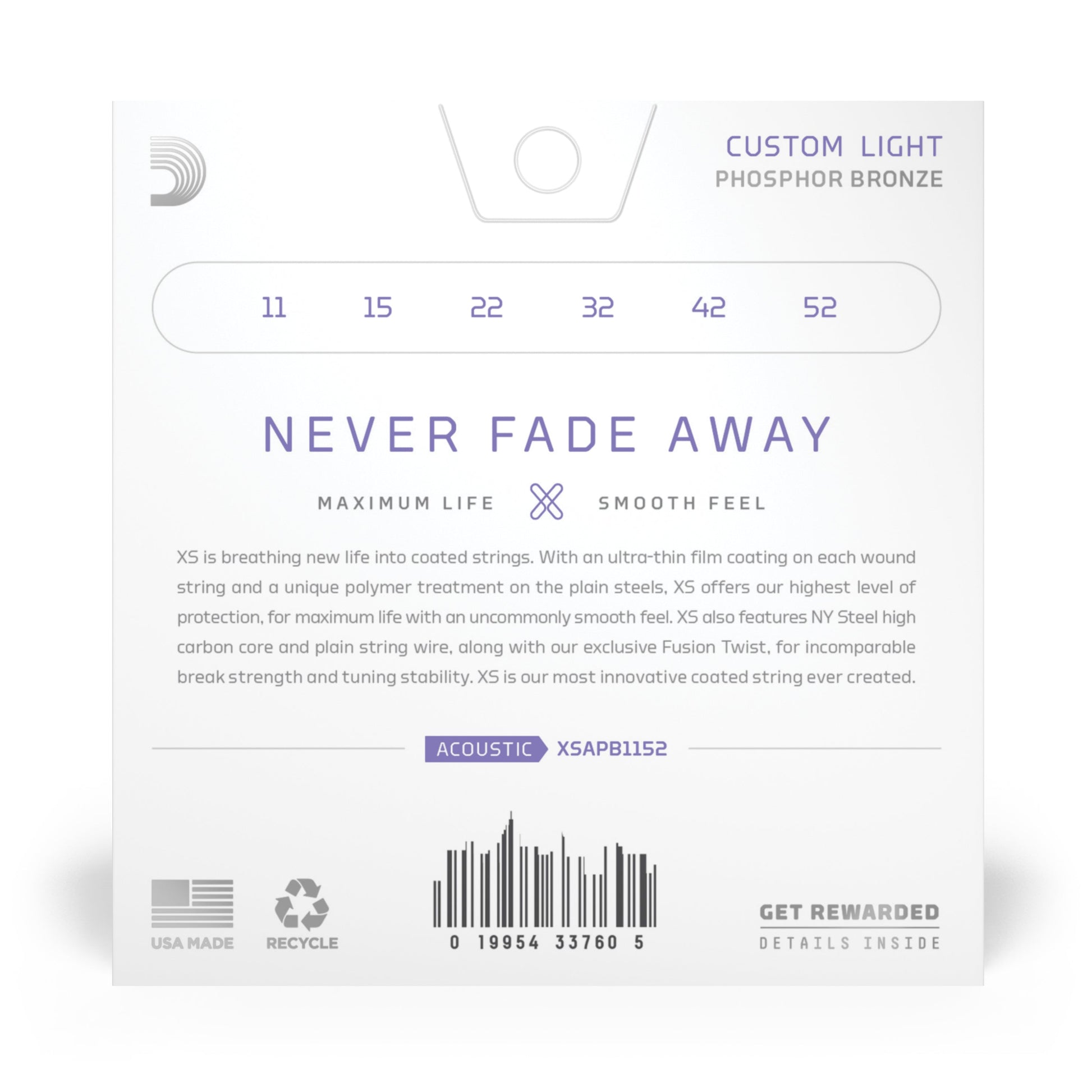 Born from our greatest breakthrough in string innovation, XS Phosphor Bronze strings have the longest life of any D’Addario acoustic guitar string. The XS coating gives our warm, balanced phosphor bronze strings maximum life, with an uncommonly smooth feel. Made with a NY Steel core, phosphor bronze wrap wire, and Fusion Twist technology, XS coated acoustic guitar strings have incomparable break strength and tuning stability, in addition to their dramatically increased lifespan. 11-52 Custom Light strings have slightly more volume and projection than Extra Light, while still being easy to play.