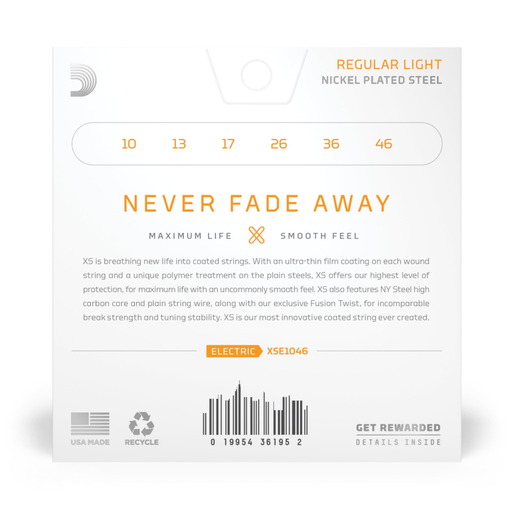 XS Nickel coated electric guitar strings provide the longest life of any D’Addario electric guitar string. Coated with our groundbreaking XS coating, these premium electric strings attain maximum life and a smooth, fast feel without dampening their outstanding tone. Constructed with a NY Steel core, reformulated nickel-plated steel wrap wire, and Fusion Twist technology, XS Nickel strings boast superior strength and tuning stability, plus richer harmonics, greater clarity, and remarkable definition with every sweep, slide, and bend. 10-46 Regular Light is our most popular electric gauge, providing a nice balance of tone and playability.